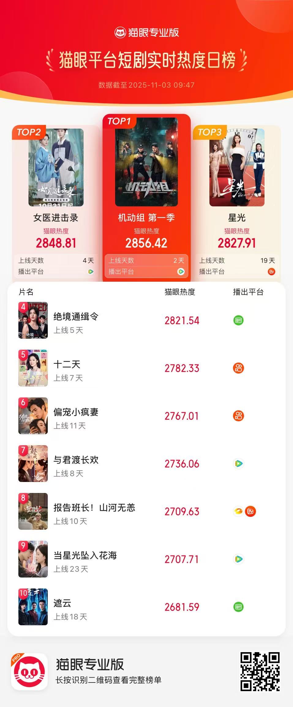11月2日,由公安部新闻传媒中心、鋆晟影业(北京)有限公司、成都鋆传文化传媒有限公司出品,SMG互联网节目中心、四川广视科教发展有限责任公司联合出品的精品短剧《机动组》在腾讯视频独家播出。该剧作为“公安部千集计划”首部作品落地四川,由四川省公安厅指导,四川省广播电视局支持,成都市公安局青白江区分局特(巡)警大队协助拍摄,荣获"跟着微短剧来学法"创作计划第一批推荐剧目,迅速登上腾讯视频短剧热搜榜前列,站内热度持续攀升,实现了主流价值与市场反响的双丰收。
